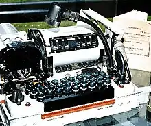 The TSEC/KL-7, also known as Adonis[1] was an off-line non-reciprocal rotor encryption machine.[3]: p.33ff [4] The KL-7 had rotors to encrypt the text, most of which moved in a complex pattern, controlled by notched rings. The non-moving rotor was fourth from the left of the stack. The KL-7 also encrypted the message indicator.
