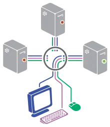 A KVM switch (with KVM being an abbreviation for "keyboard, video, and mouse") is a hardware device that allows a user to control multiple computers from one or more sets of keyboards, video monitors, and mouse.[1]
