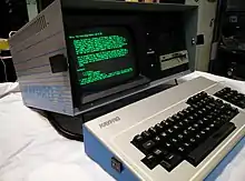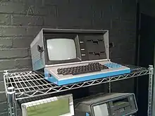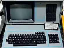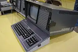 - Kaycomp II: The first Kaypro was a demonstrator model shown mainly to prospective dealers. It had the same case as future models, but was painted green, with two single sided floppy drives that were mounted vertically on opposite sides of the monitor like the Osborne 1, its intended competition, and a 9-inch internal monitor instead of the Osborne's 5-inch display.[29] A computer virtually identical to the later Kaypro II but labeled "Kaycomp" on the side was sold to the public in limited numbers. This version had two vertically mounted drives on the right and a Keytronic keyboard with all-black keys rather than the blue numeric keypad.