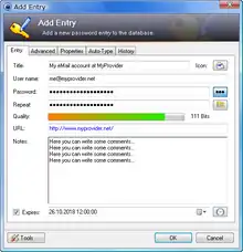 KeePass features a built-in password generator that generates random passwords. Random seeding can be done through user input (mouse movement and random keyboard input).[19]