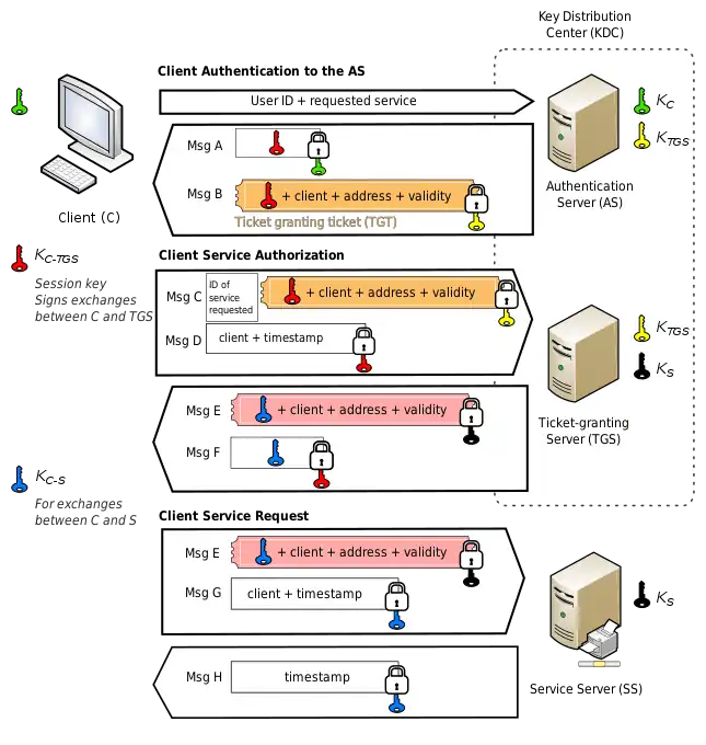 - Message G: A new Authenticator, which includes the client ID, timestamp and is encrypted using Client/Server Session Key.