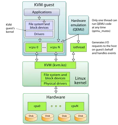 KVM itself emulates very little hardware, instead deferring to a higher level client application such as QEMU, crosvm, or Firecracker for device emulation.