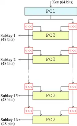 - DES has a key schedule in which the 56-bit key is divided into two 28-bit halves; each half is thereafter treated separately. In successive rounds, both halves are rotated left by one or two bits (specified for each round), and then 48 round key bits are selected by Permuted Choice 2 (PC-2) – 24 bits from the left half and 24 from the right. The rotations have the effect that a different set of bits is used in each round key; each bit is used in approximately 14 out of the 16 round keys.
