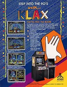 Klax is a puzzle video game released in arcades in 1990 by Atari Games while Namco distributed the game in Japanese markets. It was designed and animated by Mark Stephen Pierce with the software engineering done by Dave Akers. The object is to catch colored blocks tumbling down a machine and arrange them in colored rows and patterns to make them disappear. Klax was originally published as a coin-op follow-up to Tetris, about which Atari Games was in a legal dispute at the time.