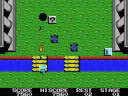 Scattered on the playfield are question mark blocks containing chess-themed magic jewels that can aid or hinder the player by shooting a block to release the jewel.[4][5][6] While many of the blocks are visible onscreen, others are hidden and must be unveiled by shooting at the block until the jewel is released.[1][2][3] The player can also uncover secret exits within certain stages and warp into the next stage.[4][7] Getting hit by an enemy or blocked by an obstacle and scrolled offscreen will result in losing a live stock, as well as a penalty of decreasing Popolon's overall firepower to his original state. The player can obtain more lives by earning 100.000 points each time or collecting a yellow magic jewel,[2][3] but the game is over once all lives are lost.