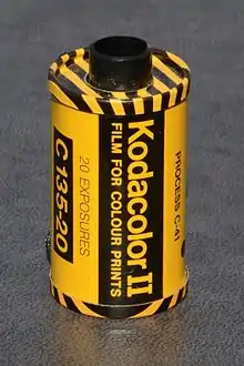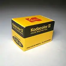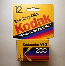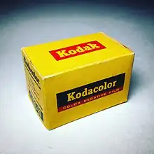 In still photography, Kodak's Kodacolor brand has been associated with various color negative films (i.e., films that produce negatives for making color prints on paper) since 1942. Kodak claims that Kodacolor was "the world's first true color negative film".[1] More accurately, it was the first color negative film intended for making paper prints: in 1939, Agfa had introduced a 35 mm Agfacolor negative film for use by the German motion picture industry, in which the negative was used only for making positive projection prints on 35 mm film.[2] There have been several varieties of Kodacolor negative film, including Kodacolor-X, Kodacolor VR and Kodacolor Gold.