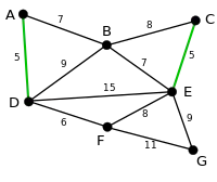 AD and CE are the shortest edges, with length 5, and AD has been arbitrarily chosen, so it is highlighted. |