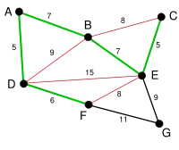 The next-shortest edges are AB and BE, both with length 7. AB is chosen arbitrarily, and is highlighted. The edge BD has been highlighted in red, because there already exists a path (in green) between B and D, so it would form a cycle (ABD) if it were chosen. |