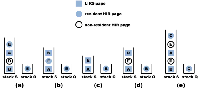 - When a HIR page in Stack S is accessed, it turns into a LIR page and accordingly the LIR page currently at Stack S’s bottom turns into a HIR page and moves to the top of Stack Q. For example, Graph (c) is produced after page E is accessed on Graph (a).