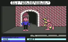 The player's goal is to locate and destroy Jareth within 13 real-time hours; otherwise, the protagonist will be trapped in the maze forever.[7][8] While traveling the maze, the player passes through a series of scrolling hallways that contain doors, enemies and other things.[7] A "radar" bar on the screen allows the player to see each hallway in miniature form: the locations of all doorways, items and characters in a given hallway are displayed.[7][9] Unlike other adventure games of the period, Labyrinth does not feature a command-line interface. Instead of typing commands, the player selects them from two scrolling "word wheels", one for verbs and one for nouns.[1][6][10] For example, the verb "congratulate" may be selected in one wheel, and the noun "Jareth" in the other: this inputs the command "congratulate Jareth".[1] Based on the player's items and location, the available verbs and nouns change context-sensitively.[6]