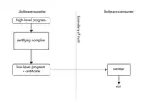 The figure illustrates how certification and verification of low-level code could be established by the use of a certifying compiler. The software supplier gains the advantage of not having to reveal the source code, and the consumer is left with the task of verifying the certificate, which is an easy task compared to evaluation and compilation of the source code itself. Verifying the certificate only requires a limited trusted code base containing the compiler and the verifier.