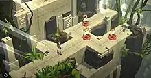 Lara Croft Go is a turn-based puzzle video game in the Tomb Raider franchise. Its core gameplay and control-scheme is similar to its predecessor, Hitman Go. Levels are composed of interconnected nodes and lines. The player controls the series' protagonist, Lara Croft. The player and the environment take turns, in which one rests while the other moves. During the player's turn, the player moves Croft one unit between connected nodes in the given direction.[2] While Croft rests at the node, enemies and obstacles on the board simultaneously take a turn to simultaneously move one unit.[3] While levels in Hitman Go were restricted to the horizontal plane, Lara Croft Go adds vertical movement with steps, cliff faces, and climbable terrain incorporated into the level design.[4] The game contains five chapters and forty levels in total.[3][5]