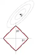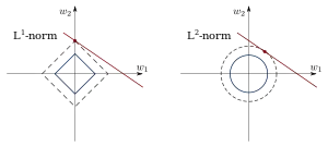 but with respect to different constraints: for lasso and for ridge. The figure shows that the constraint region defined by the norm is a square rotated so that its corners lie on the axes (in general a cross-polytope), while the region defined by the norm is a circle (in general an n-sphere), which is rotationally invariant and, therefore, has no corners. As seen in the figure, a convex object that lies tangent to the boundary, such as the line shown, is likely to encounter a corner (or a higher-dimensional equivalent) of a hypercube, for which some components of are identically zero, while in the case of an n-sphere, the points on the boundary for which some of the components of are zero are not distinguished from the others and the convex object is no more likely to contact a point at which some components of are zero than one for which none of them are.