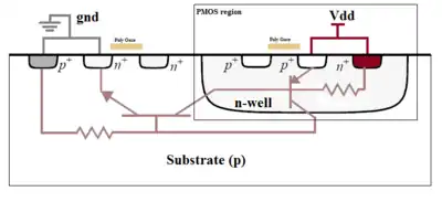 Consider the n-well structure in the first figure. The n-p-n-p structure is formed by the source of the NMOS, the p-substrate, the n-well and the source of the PMOS. A circuit equivalent is also shown. When one of the two bipolar transistors gets forward biased (due to current flowing through the well, or substrate), it feeds the base of the other transistor. This positive feedback increases the current until the circuit fails or burns out.