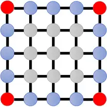 A typical algorithm to solve the leader election in an unoriented mesh is to only elect one of the four corner nodes as the leader. Since the corner nodes might not be aware of the state of other processes, the algorithm should first wake up the corner nodes. A leader can be elected as follows.[17]