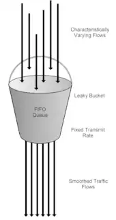 - A fixed capacity bucket, associated with each virtual connection or user, leaks at a fixed rate.