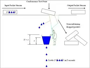 Another description of what is essentially the same meter version of the algorithm, the generic cell rate algorithm, is given by the ITU-T in recommendation I.371 and in the ATM Forum's UNI Specification.[4][5] The description, in which the term cell is equivalent to packet in Turner's description[2] is given by the ITU-T as follows: "The continuous-state leaky bucket can be viewed as a finite capacity bucket whose real-valued content drains out at a continuous rate of 1 unit of content per time unit and whose content is increased by the increment T for each conforming cell... If at a cell arrival the content of the bucket is less than or equal to the limit value τ, then the cell is conforming; otherwise, the cell is non-conforming. The capacity of the bucket (the upper bound of the counter) is (T + τ)".[5] These specifications also state that, due to its finite capacity, if the contents of the bucket at the time the conformance is tested is greater than the limit value, and hence the cell is non-conforming, then the bucket is left unchanged; that is, the water is simply not added if it would make the bucket overflow.