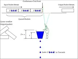 In the second version, the bucket is a queue in the flow of traffic.[3] This queue is used to directly control that flow: Packets are entered into the queue as they arrive, equivalent to the water being added to the bucket. These packets are then removed from the queue (first come, first served), usually at a fixed rate, e.g. for onward transmission, equivalent to water leaking from the bucket. This configuration imposes conformance rather than checking it, and where the output is serviced at a fixed rate (and where the packets are all the same length), the resulting traffic stream is necessarily devoid of burstiness or jitter. So in this version, the traffic itself is the analogue of the water passing through the bucket. This version is referred to here as leaky bucket as a queue.