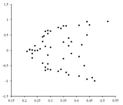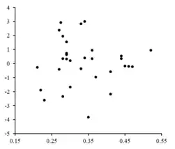 A special case of generalized least squares called weighted least squares occurs when all the off-diagonal entries of Ω (the correlation matrix of the residuals) are null; the variances of the observations (along the covariance matrix diagonal) may still be unequal (heteroscedasticity). In simpler terms, heteroscedasticity is when the variance of depends on the value of which causes the residual plot to create a "fanning out" effect towards larger values as seen in the residual plot to the right. On the other hand, homoscedasticity is assuming that the variance of and variance of are equal.[10]