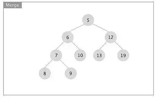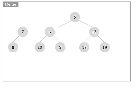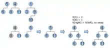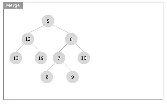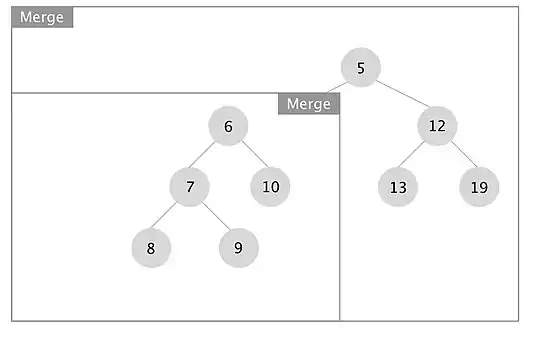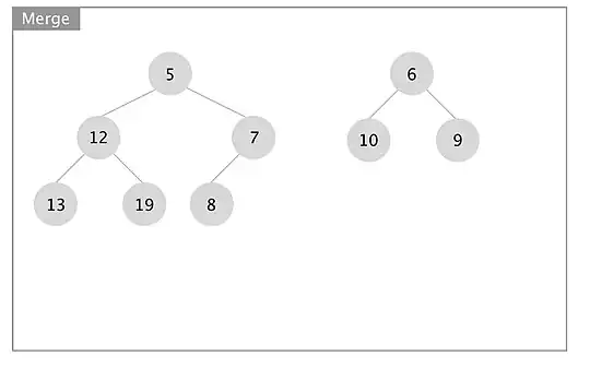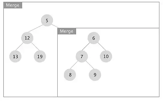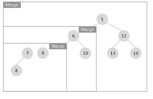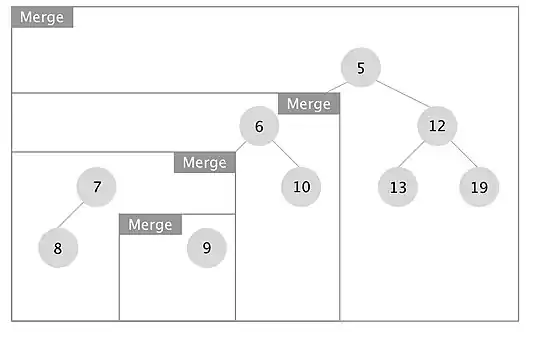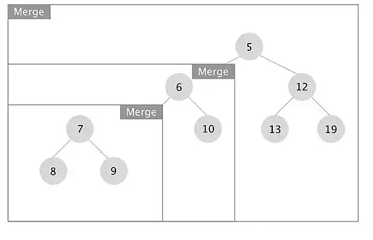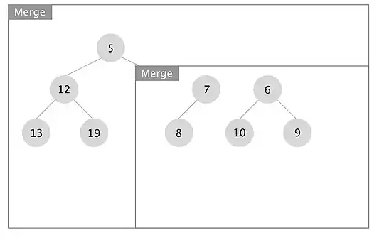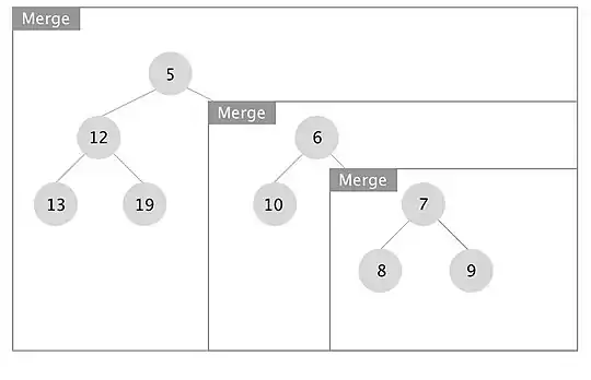 In part 2 a slightly more complex merge happens. The tree with the lower value (tree x) has a right child, so merge must be called again on the subtree rooted by tree x's right child and the other tree. After the merge with the subtree, the resulting tree is put back into tree x. The s-value of the right child (s=2) is now greater than the s-value of the left child (s=1), so they must be swapped. The s-value of the root node 4 is also now 2.