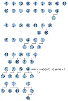 To initialize a min HBLT, place each element to be added to the tree into a queue. In the example (see Part 1 to the left), the set of numbers [4, 8, 10, 9, 1, 3, 5, 6, 11] are initialized. Each line of the diagram represents another cycle of the algorithm, depicting the contents of the queue. The first five steps are easy to follow. Notice that the freshly created HBLT is added to the end of the queue. In the fifth step, the first occurrence of an s-value greater than 1 occurs. The sixth step shows two trees merged with each other, with predictable results.