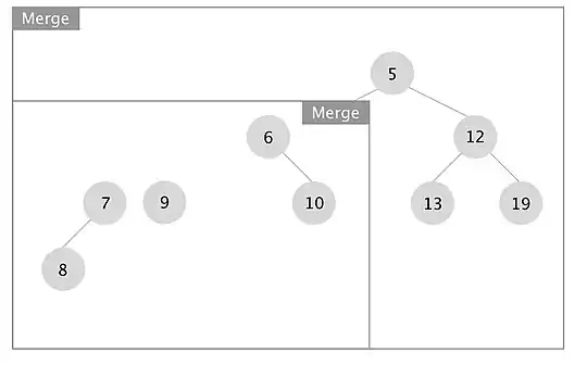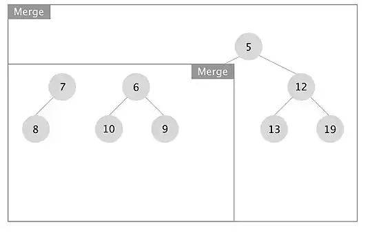 Part 3 is the most complex. Here, we recursively call merge twice (each time with the right child 's subtree that is not grayed out). This uses the same process described for part 2.