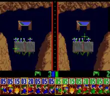 Levels were designed based on a Deluxe Paint interface, which allowed several of the members to design levels, resulting in "hundreds of levels".[23] There were several internal iterations of the levels, each designer challenging the others. Dailly pointed out that David Jones "used to try and beat us, and after proudly stabbing a finger at the screen and saying 'There! Beat that!', we'd calmly point out a totally new way of getting around all his traps, and doing it in a much simpler method. 'Oh...', he'd mutter, and scramble off to try and fix it." They also sent internally tested levels to Psygnosis, getting back the results of their testing via fax. While most were solved quickly, Dailly commented that "Every now and again though, the fax would be covered in scribbles with the time and comments crossed out again and again; this is what we were striving for while we were designing the levels, and it gave us all a warm fuzzy feeling inside."[22]