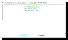 An Apache-licensed[52] Python certificate management program called certbot (formerly letsencrypt) gets installed on the client side (the Web server of an enrollee). This is used to order the certificate, to conduct the domain validation process, to install the certificate, to configure the HTTPS encryption in the HTTP server, and later to regularly renew the certificate.[15][53] After installation and agreeing to the user license, executing a single command is enough to get a valid certificate installed. Additional options like OCSP stapling or HTTP Strict Transport Security (HSTS) can also be enabled.[46] Automatic setup initially only works with Apache and nginx.