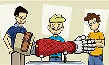 The idea of Limbitless Solutions came to life in 2014 after a team of engineering students at the University of Central Florida led an initiative to provide bionic 3D printed limbs to children. In their free time, the students took advantage of a donated Stratasys Dimension 3D printer in the engineering manufacturing lab on campus to create an affordable prosthetic that displayed their ideas of art and engineering all into one. Their method was the first of its kind and minimized the cost and time of traditional prosthetic manufacturing processes like CNC milling.[4][5] The first 3D printed arm the students created was run with off-the-shelf servos and batteries which are activated by the electromyography muscle energy on the child's limb.[6] Most prosthetic arms are mechanical, which presents a challenge for children without elbows because they have to open and close their mechanical prosthetic by bending their elbow. That led the Limbitless team to come up with the idea for an electronic arm with a muscle sensor that allows the child to open and close their prosthetic hand by flexing their biceps.[7]