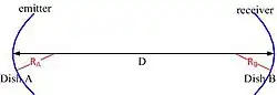 The system considered is depicted in the figure to the right: two dishes – one being the emitter and the other one the receiver – and a signal travelling between them over a distance D. First, for dish A (emitter), the LCT matrix looks like this: