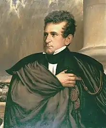 The first New Jersey State Constitution, ratified in 1776, provided that a governor be elected annually by the state legislature, the members of which were selected by the several counties.[2] Under this constitution, the governor was president of the upper house of the legislature, then called the Legislative Council.[2] The 1844 constitution provided for a popular vote to elect the governor,[3] who no longer presided over the upper house of the legislature, now called the Senate. The 1844 constitution also lengthened the governor's term to three years, set to start on the third Tuesday in January following an election, and barred governors from succeeding themselves.[4] The 1947 constitution extended terms to four years, and limits governors from being elected to more than two consecutive terms, though they can run again after a third term has passed.[5] Joseph Bloomfield, Peter Dumont Vroom, Daniel Haines, Joel Parker, Leon Abbett, and Walter Evans Edge each served two non-consecutive stints as governor while A. Harry Moore served three non-consecutive stints. Foster McGowan Voorhees, James Fairman Fielder, and Richard Codey each served two non-consecutive stints, one as acting governor and one as official governor.