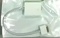 | Apple Digital AV Adapter | ![]() | Released with iPad 2 and mirrors video output. This adapter allows the user to mirror anything on the iPad's (iPad 2 or later) screen to an HDTV or any other HDMI-compatible display, in up to 1080p, so that whatever the iPad's user does is viewable to the audience watching on the larger HDMI-compatible display. The Apple Digital AV Adapter connects to the iPad 2 or later or iPad 2 Dock via the 30-pin dock connector, whilst the other end has two connections; one is a 30-pin dock connector to charge/power the device whilst being used, the other is a HDMI-out for connecting to any HDMI-compatible display using an HDMI cable. | iPad (1st generation) | [5][8] |