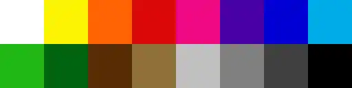 0 — white 8 — green 1 — yellow 9 — dark green 2 — orange 10 — brown 3 — red 11 — tan 4 — magenta 12 — light grey 5 — purple 13 — medium grey 6 — blue 14 — dark grey 7 — cyan 15 — black