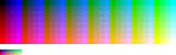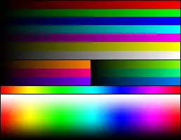 For each unique palette, an image color test chart and sample image (truecolor original follows) rendered with that palette (without dithering) are given. The test chart shows the full 8-bit, 256 levels of the red, green, and blue (RGB) primary colors and cyan, magenta, and yellow complementary colors, along with a full 8-bit, 256 levels grayscale. Gradients of RGB intermediate colors (orange, lime green, sea green, sky blue, violet and fuchsia), and a full hue spectrum are also present. Color charts are not gamma corrected.