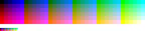 Red #000000 #240000 #490000 #6D0000 #920000 #B60000 #DB0000 #FF0000 Green #000000 #002400 #004900 #006D00 #009200 #00B600 #00DB00 #00FF00 Blue #000000 #000055 #0000AA #0000FF