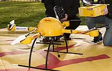 UAVs can transport medicines and medical specimens into and out of inaccessible regions.[44] In 2013, in a research project of DHL, a small quantity of medicine was delivered via a UAV.[66][67]