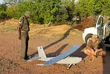 In 2011, Lian Pin Koh and Serge Wich conceived the idea of using UAVs for conservation-related applications, before founding ConservationDrones in 2012.[75] ConservationDrones works with NGOs, research organizations, and governments to collect environmental data through drone usage. They also work to provide low cost UAVs to these organizations, especially in developing countries, for as little as $2500.[76] UAV usage in conservation is able to alleviate many of the challenges facing conservationists on foot, such as "the large size of species’ geographic ranges, low population densities, inaccessible habitat, elusive behavior and sensitivity to disturbance."[77] By 2012 the International Anti-Poaching Foundation was using UAVs.[78] A whale conservation UAV capable of collecting blowhole mucus into a sterile petri dish was put into use in January 2018 following its development by researchers at Macquarie University in Sydney, Australia.[79]