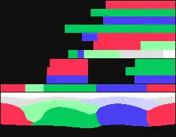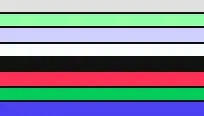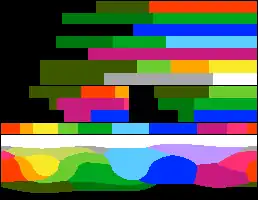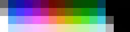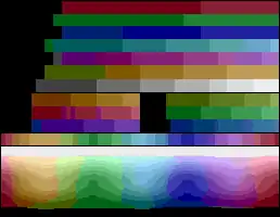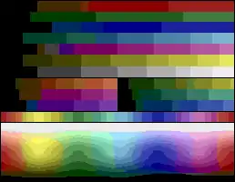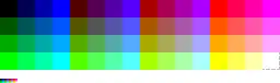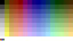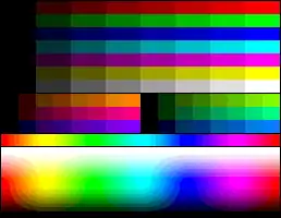 For each unique palette, an image color test chart and sample image (original True color version follows) rendered with that palette (without dithering unless otherwise noted) are given. The test chart shows the full 8-bit, 256 levels of the red, green and blue (RGB) primary colors and cyan, magenta and yellow complementary colors, along with a full 8-bit, 256 levels grayscale. Gradients of full saturation of intermediate colors (orange, yellow-green, green-cyan, blue-cyan, violet, and red-magenta), and a full hue spectrum are also present. Color charts are not gamma corrected.