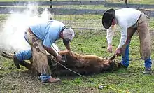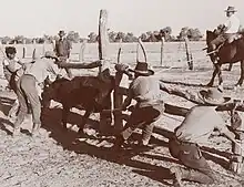 Bronco branding is an old method of catching cleanskin (unbranded) cattle on Top End cattle stations for branding in Australia. A heavy horse, usually with some draught horse bloodlines and typically fitted with a harness horse collar, is used to rope the selected calf. The calf is then pulled up to several sloping topped panels and a post constructed for the purpose in the centre of the yard. The unmounted stockmen then apply leg ropes and pull it to the ground to be branded, earmarked and castrated (if a bull) there. With the advent of portable cradles, this method of branding has been mostly phased out on stations. However, there are now quite a few bronco branding competitions at rodeos and campdrafting days, etc.[9]