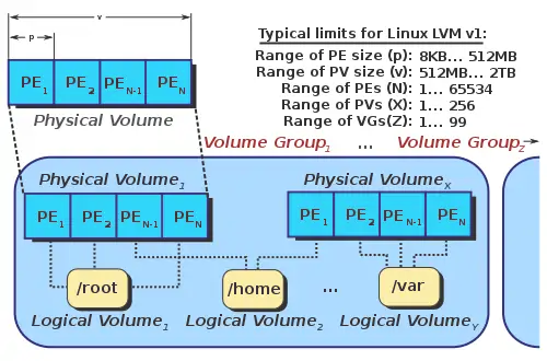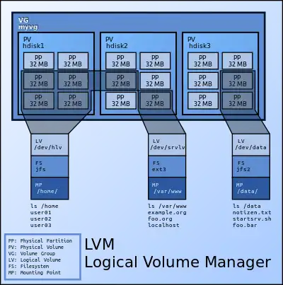 In Linux, Logical Volume Manager (LVM) is a device mapper framework that provides logical volume management for the Linux kernel. Most modern Linux distributions are LVM-aware to the point of being able to have their root file systems on a logical volume.[3][4][5]