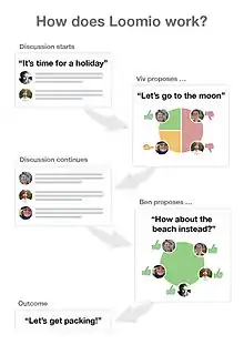 Loomio is decision-making software and web service designed to assist groups with collaborative, consensus-focused decision-making processes. It is a free software[3] web application, where users can initiate discussions and put up proposals.[4][5][6][7] As the discussions progress to initiating a proposal, the group receives feedback through an updatable pie chart[5] or other data visualizations. Loomio is basically a web based forum (has optional email delivery interface) with tools to facilitate conversations and decision making processes from starting and holding conversations to reaching outcome.[8]
