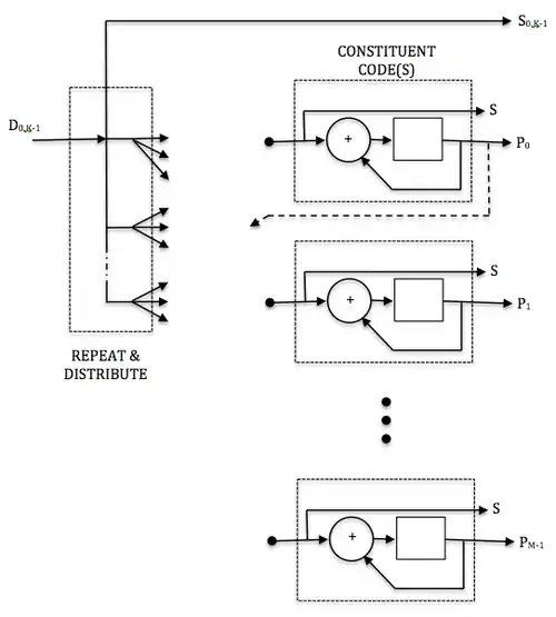 For comparison, classic turbo codes typically use two constituent codes configured in parallel, each of which encodes the entire input block (K) of data bits. These constituent encoders are recursive convolutional codes (RSC) of moderate depth (8 or 16 states) that are separated by a code interleaver which interleaves one copy of the frame.