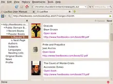 Lucifox is a discontinued free and open source add-on for the browser Mozilla Firefox that manages, downloads and displays e-books. It supports EPUB 3 and EPUB 2 formatted books without digital rights management (DRM) and retrieval of books from online book catalogues using the Open Publication Distribution System (OPDS). It is part of the Lucidor suite of free and open source e-book software made by the Swedish developer Ordbrand.[2]
