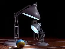 Luxo Jr. is a semi-anthropomorphic toy desk lamp character used as the primary mascot of Pixar Animation Studios. He is the protagonist of the short film Luxo Jr. and appears on the production logo of every Pixar film, hopping into view and jumping on the capital letter "I" in "PIXAR" to flatten it. John Lasseter created the character, modeling it after his own Luxo brand lamp.[1] In 2009, the manufacturer of Luxo lamps sued Disney, the parent company of Pixar, for selling Luxo Jr.-branded merchandise.[2]