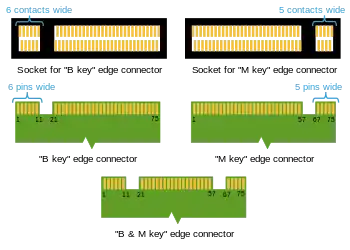 The PCB of an M.2 module provides a 75-position edge connector; depending on the type of module, certain pin positions are removed to present one or more keying notches. Host-side M.2 connectors (sockets) may populate one or more mating key positions, determining the type of modules accepted by the host; as of April 2014, host-side connectors are available with only one mating key position populated (either B or M).[5][14][11] Furthermore, M.2 sockets keyed for SATA or two PCI Express lanes (PCIe ×2) are referred to as "socket 2 configuration" or "socket 2", while the sockets keyed for four PCI Express lanes (PCIe ×4) are referred to as "socket 3 configuration" or "socket 3".[2]: 15 [24]