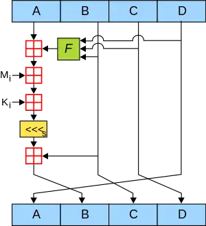 The main MD5 algorithm operates on a 128-bit state, divided into four 32-bit words, denoted A, B, C, and D. These are initialized to certain fixed constants. The main algorithm then uses each 512-bit message block in turn to modify the state. The processing of a message block consists of four similar stages, termed rounds; each round is composed of 16 similar operations based on a non-linear function F, modular addition, and left rotation. Figure 1 illustrates one operation within a round. There are four possible functions; a different one is used in each round: