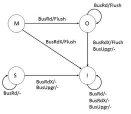 While in the Owner (O) state and there is a snooped read request (BusRd), the block remains in the same state while flushing (Flush) the data for the other processor to read from it. With a snooped write request (BusRdX), the block changes state to invalid (I) along with flushing (Flush) the data as another processor is writing to it, thereby losing its ownership on that block. Whenever another processor tries to access that block, instead of going to the memory to access it, the processor takes it from other cache which already has that block in the owned (O) state. With a BusUpgr, it just changes the state from owner (O) to invalid (I).[3]