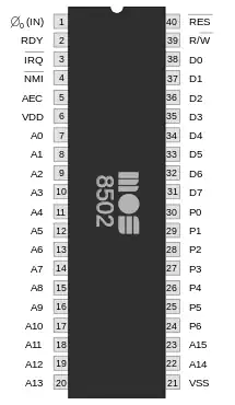 The pinout is slightly different than the 6510. The 8502 has an extra I/O-pin (the built-in I/O port mapped to addresses 0 and 1 is extended from 6 to 7 bits) and lacks the ϕ2-pin that the 6510 had. The 8502 family also includes the MOS 7501, 8500 and 8501.