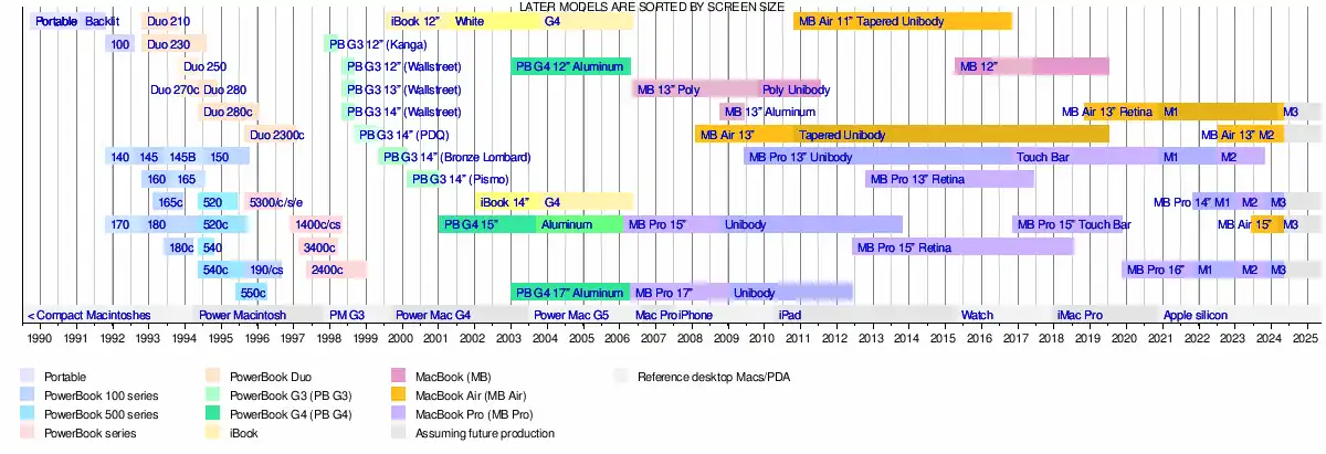Apple WatchMac ProPower Mac G5Power Macintosh G3Compact MacintoshMacBook Pro (Apple silicon)MacBook Air (Apple silicon)MacBook Pro (Apple silicon)MacBook Pro (Apple silicon)MacBook Air (Apple silicon)MacBook Pro (Apple silicon)MacBook Pro (Apple silicon)MacBook Pro (Apple silicon)MacBook Pro (Apple silicon)MacBook Pro (Intel-based)MacBook Pro (Intel-based)MacBook Pro (Apple silicon)MacBook Pro (Intel-based)MacBook Pro (Intel-based)MacBook Pro (Intel-based)MacBook Pro (Intel-based)MacBook Pro (Intel-based)MacBook Pro (Intel-based)MacBook Pro (Intel-based)MacBook Pro (Intel-based)PowerBook G4PowerBook G4PowerBook G3PowerBook G3PowerBook 2400cPowerBook 3400cPowerBook 1400PowerBook 5300PowerBook 500 seriesPowerBook 190PowerBook G4PowerBook 150PowerBook 500 seriesPowerBook 500 seriesPowerBook 500 seriesPowerBook 500 seriesPowerBook 160PowerBook 140PowerBook 180PowerBook 180PowerBook 160PowerBook 160PowerBook 140PowerBook 170PowerBook 140MacBook Air (Apple silicon)MacBook Air (Apple silicon)MacBook Air (Apple silicon)MacBook Air (Intel-based)12-inch MacBookMacBook Air (Intel-based)MacBook Air (Intel-based)MacBook (2006–2012)PowerBook Duo 210MacBook Air (Intel-based)MacBook (2006–2012)MacBook (2006–2012)PowerBook G4PowerBook 100Macintosh PortablePowerBook G3PowerBook G3PowerBook G3PowerBook G3PowerBook G3PowerBook DuoPowerBook DuoPowerBook DuoMacintosh PortablePowerBook DuoPowerBook DuoPowerBook Duo 230Macintosh Portable