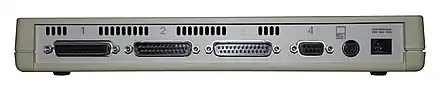 The MacEnhancer is an expansion box less than 12 inches (30 cm) wide, 4 inches (10 cm) deep, and 1 inch (2.5 cm) high.[6] It connects to the Macintosh via a cable with an 8-pin mini-DIN connector to the MacEnhancer side and a DE-9 connector on the Macintosh side, to either the Macintosh's RS-422 printer or modem connectors.[3][5] The MacEnhancer has four ports—one Macintosh-standard DE-9 connector (as a passthrough for the occupied modem or printer connector), two IBM-standard DB-25 RS-232 serial ports, and one IBM-standard DB-25 parallel port.[7] Accompanying floppy disks with the MacEnhancer provide the user with a utility used to control the MacEnhancer, device drivers for numerous contemporary printers, and MacTerminal—a terminal emulator.[8] While the MacEnhancer allows multiple devices to be connected to it, it does not support output to more than one port at a time.[9] The included MacEnhancer software utility allows the user to switch the active port.[10]